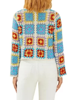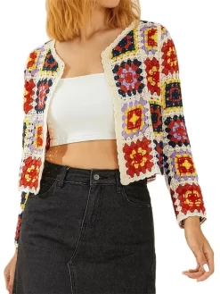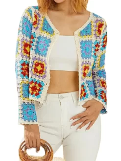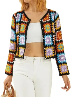 Women Knit Cardigan, Retro Colorful Square Print Long Sleeve V-Neck Button Closure Hollow Out Knitwear